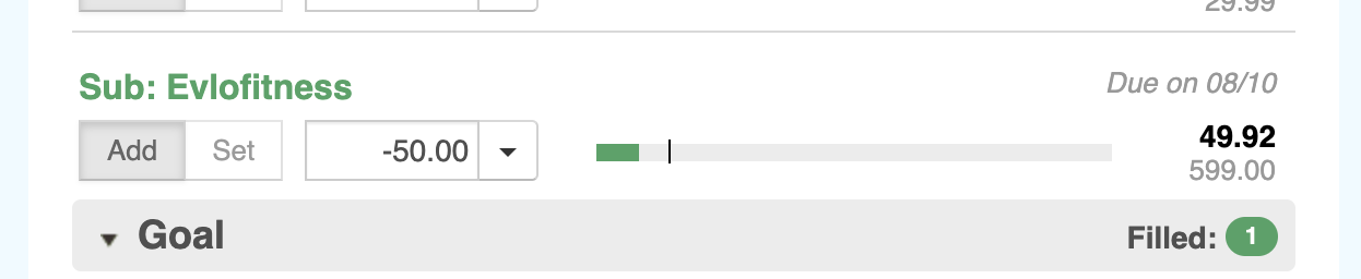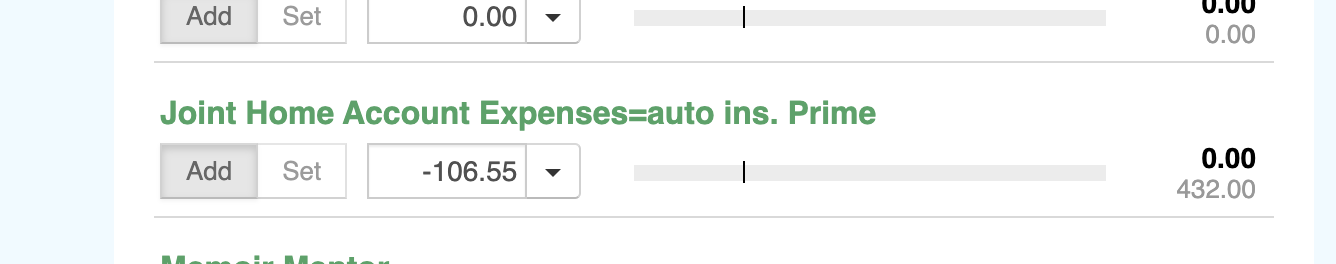- Two other envelopes indicate subtracted amounts. The Sub: Evlofitness envelope shows -50 and the Joint Home Account Expenses=auto ins. Prime envelope shows -106.55.